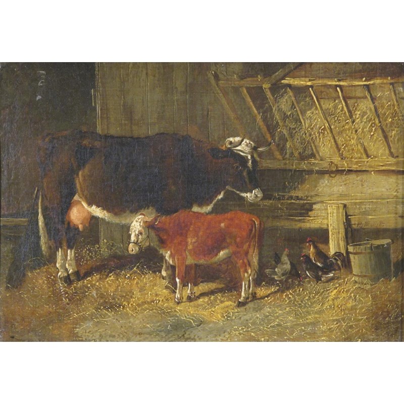 Henry A. Woollett (fl. 1851-1898) A cow and calf in a barn Signed Oil on canvas 26 x 36cm; 10¼ x...