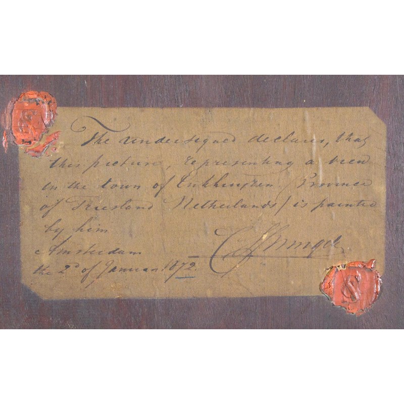 Signed and dated 1871 also signed and inscribed on an original label verso: The undersigned declares that this picture, representing a view of the town of Enkhuyzen, province of Freesland Netherlands, is painted by him, Amsterdam, the 2nd January 1872 C. Springer