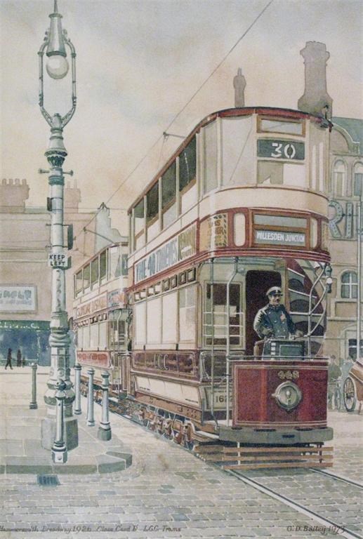 Signed and dated 1973 and inscribed Hammersmith Broadway 1926, Class 'C' and 'D' L.G.G. Trams
