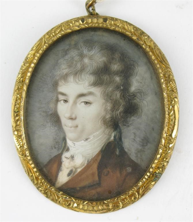Circle of Richard Cosway Portrait of a gentleman wearing a red coat and a white stock Oval in a...