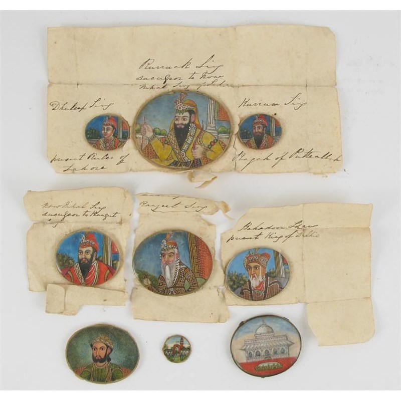 A collection of 14 Indian miniatures - 11 portraits of Indian Princes including Ranjeet Sing, Dhuleep Sing and 3 miniature studies of Indian temples and towers