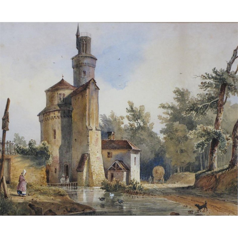 Francois Antoine Bossuet (1800-1899) Figures by a stream and tower in a village Signed ...