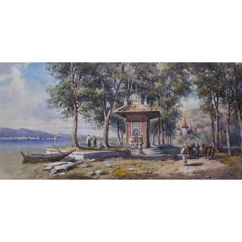 Claude Rowbotham (1864-1949) A river view in India with figures by a grand public water fountain...