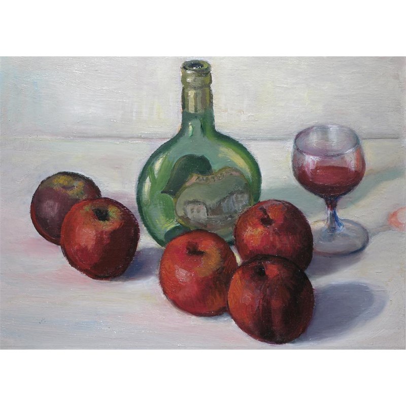 Ken Leech (20th Century) Miniature wine bottle apples and a glass; lemons and glasses A pair