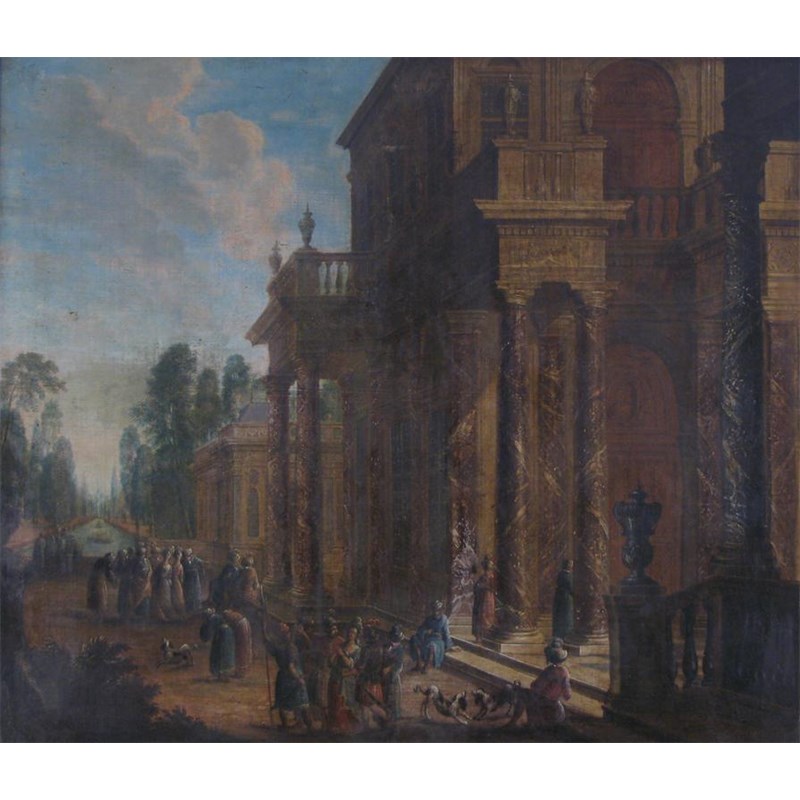 Flemish School late 18th Century Eastern figures by a classical palace