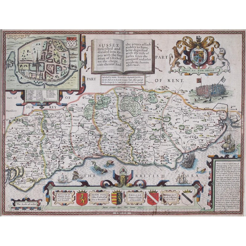 Sussex - Speed (John), Sussex, described and divided, hand-coloured engraved map with inset plan of Chichester, 400 x 515mm, [Sudbury & Humble?], 1610