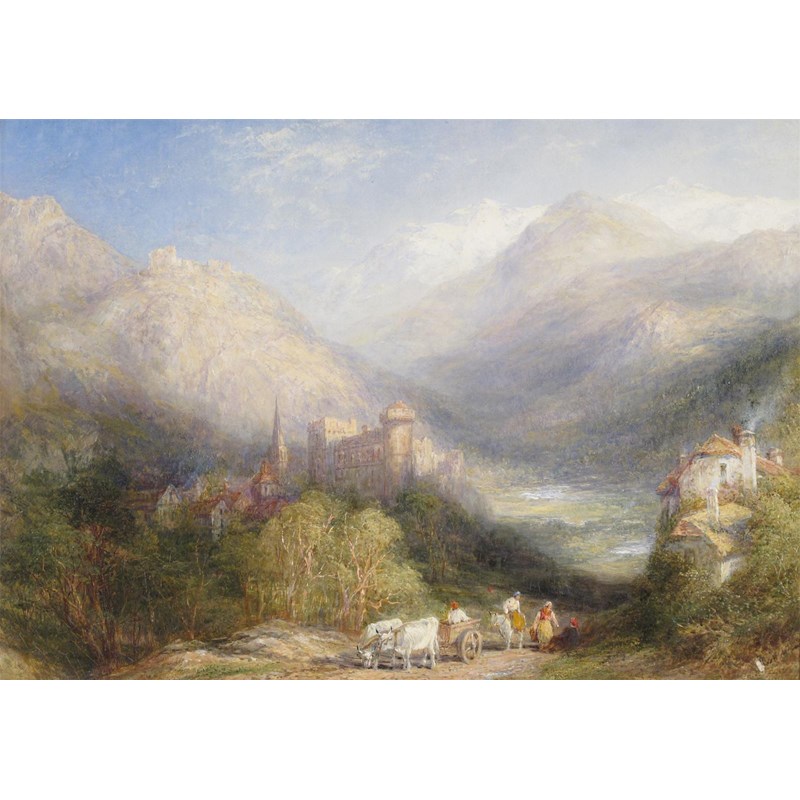 Continental School 19th Century Alpine landscape with travellers near a castle Oil on canvas 31 x...