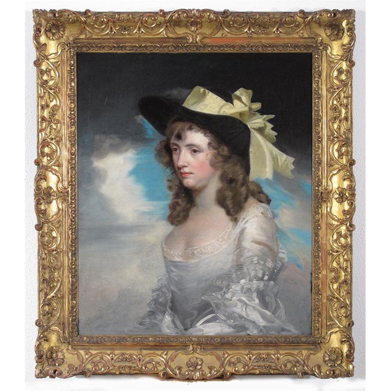 Attributed to John Hoppner R.A. (1758-1910) Portrait of a lady, possibly Mrs Crewe Oil on canvas 76 x 64cm; 30 x 25in Mrs. Frances Crewe was one of the best known Whig hostesses. She was famous for her beauty and Mary Robinson in Beaux and Belles of England states she looked like the sister of her 21 year old son even when in her 40s. She was also renowned for campaigning for Charles James Fox in the 1784 Westminster Election alongside the Duchess of Devonshire wearing the buff and light-blue colours of the Whig Party. After winning the election, the Prince of Wales famously gave the toast: "Buff and Blue and Mrs. Crewe". It is recorded in David Mannings' book on Sir Joshua Reynolds, that Mrs. Crewe sat to Reynolds in the early 1780s, which might mean a portrait from this period was at least begun but remains untraced. Mannings also recorded that John Hoppner's early work of the 1780s is similar to Reynolds' late works.