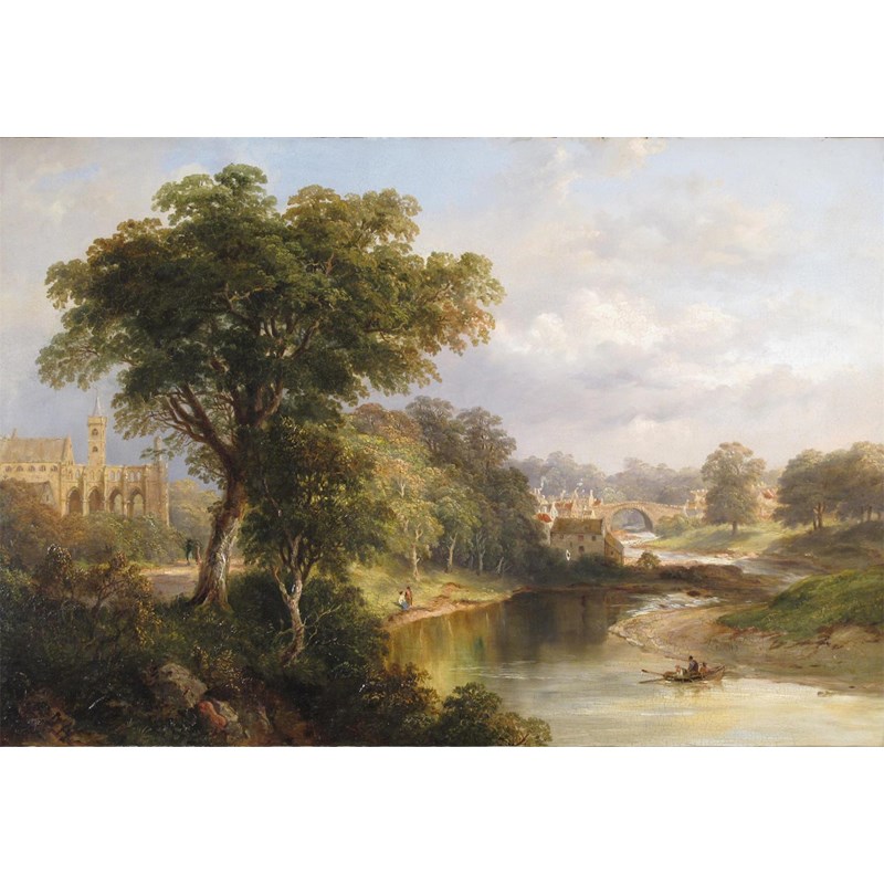 Figures in a river landscape with an abbey and a town beyond