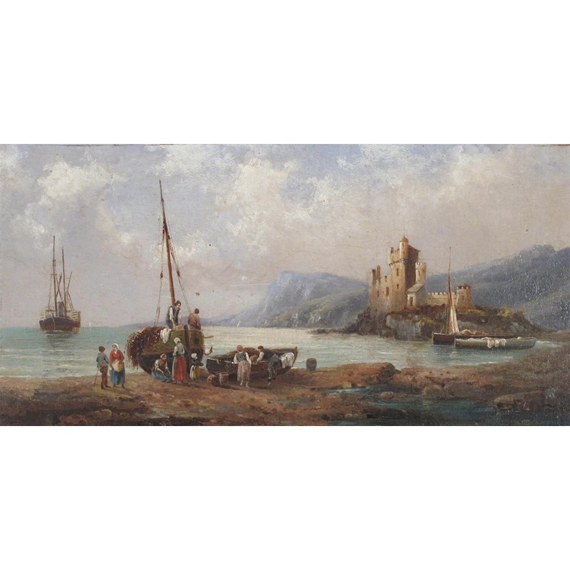 Fisherfolk on the shore, a castle beyond