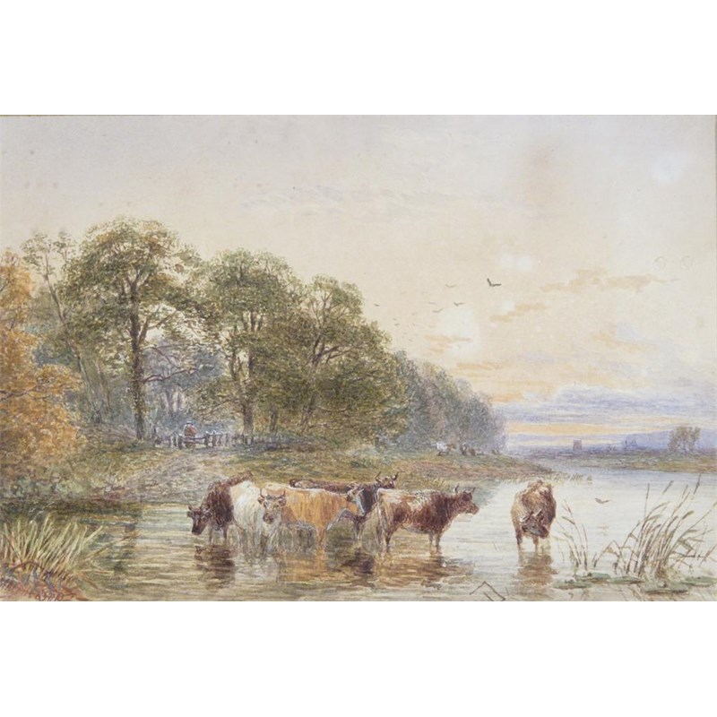 John Macpherson (act. 1858-1884) Cattle watering in a river Signed Watercolour heightened with...
