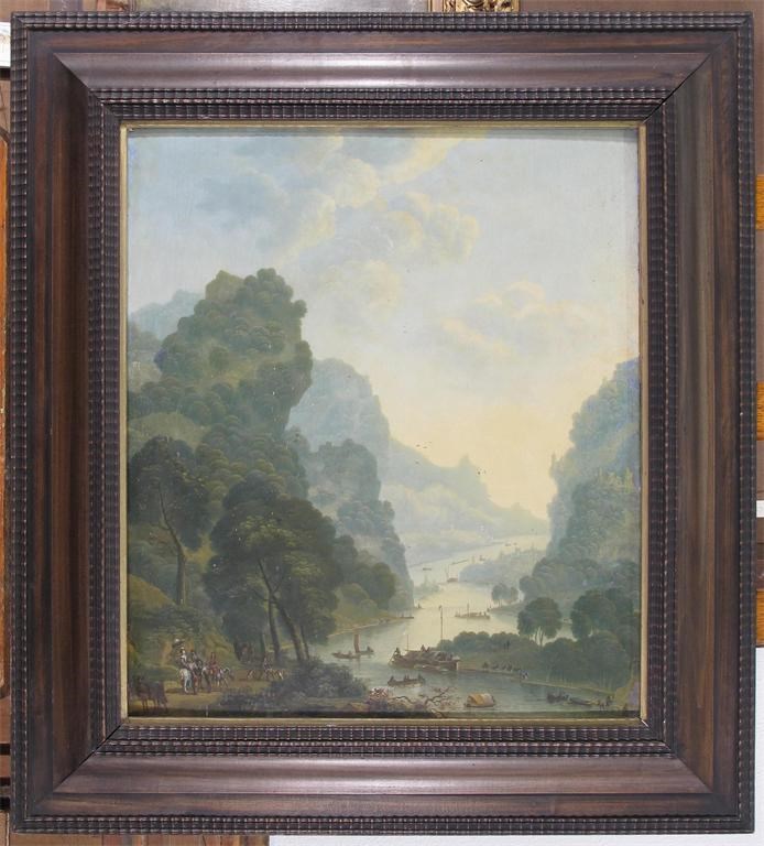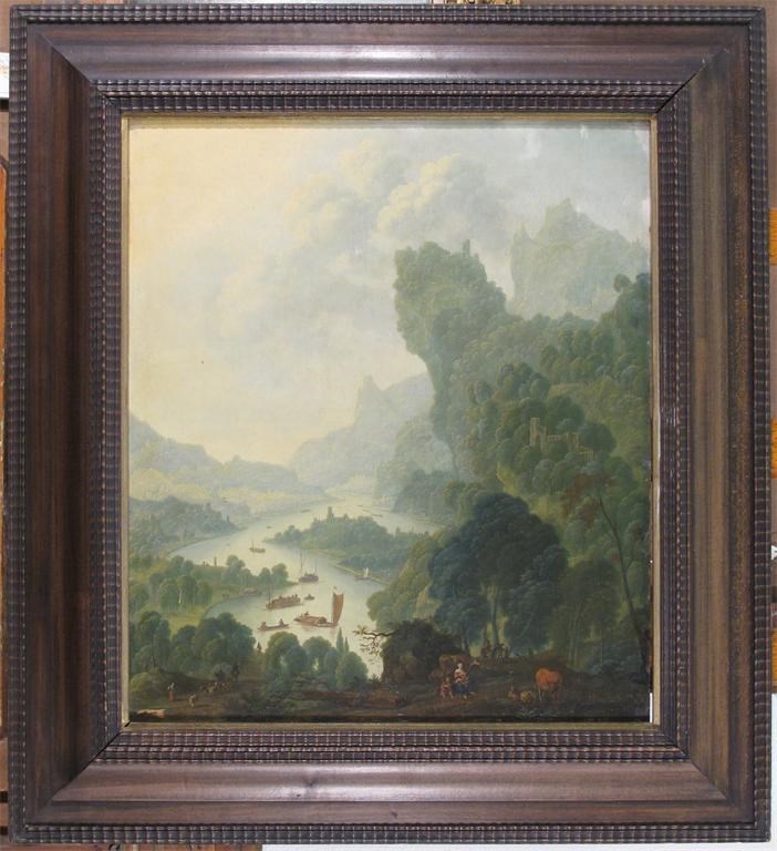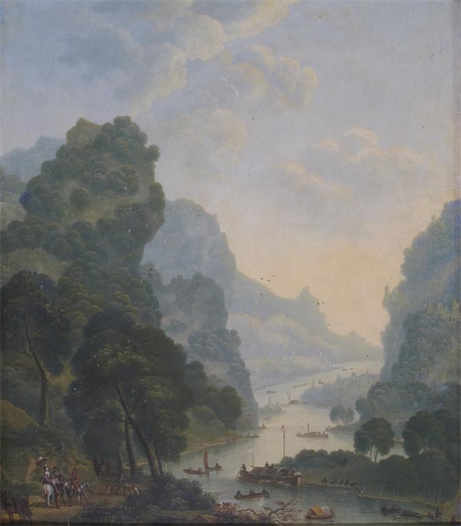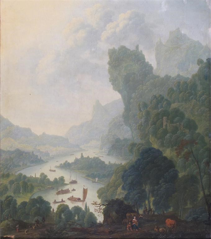Extensive wooded river landscapes, probably on the Rhine with numerous boats and travellers in the foreground