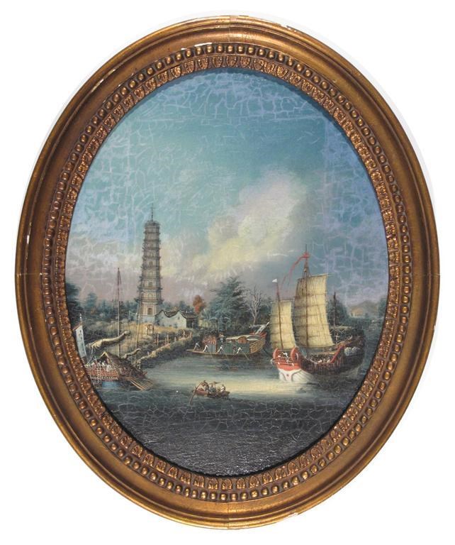 Coastal scenes near Macao with two women rowing a junk and ships near a temple
