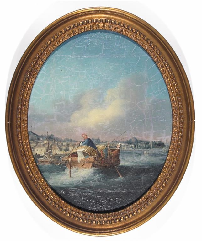 Attributed to George Chinnery (1774-1852) Coastal scenes near Macao with two women rowing a junk...