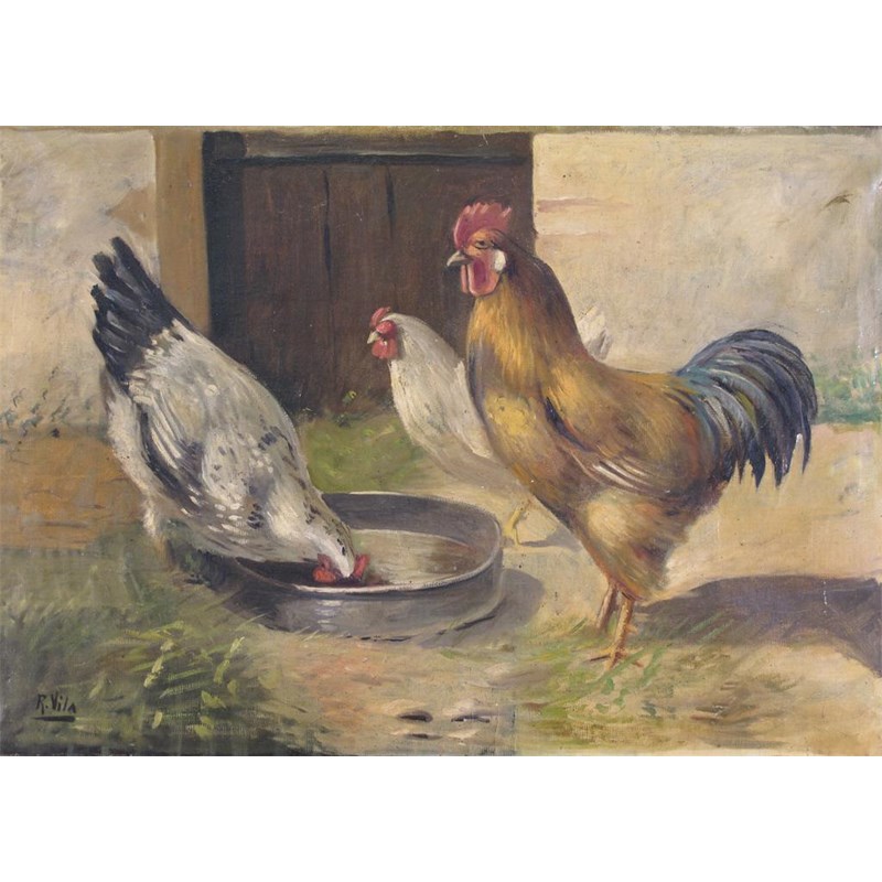 R. Vila (20th Century) Three chickens feeding Signed Oil on canvas 50 x 73cm; 19¾ x 28¾in