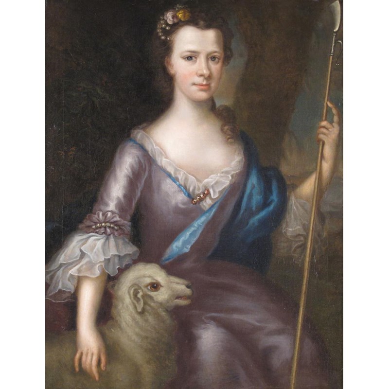 Portrait of a girl, three-quarter length seated in a landscape dressed as a shepherdess, a lamb at her side