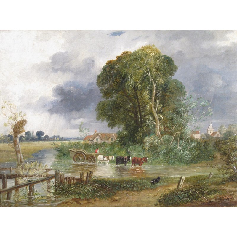 Manner of John Constable A river landscape with a horse and cart crossing a river near a cottage