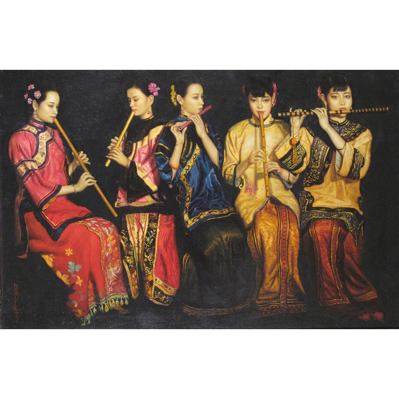 After Chen Yifei (Chinese 1946-2005) Five young women playing flutes Inscribed Oil on canvas 61 x...