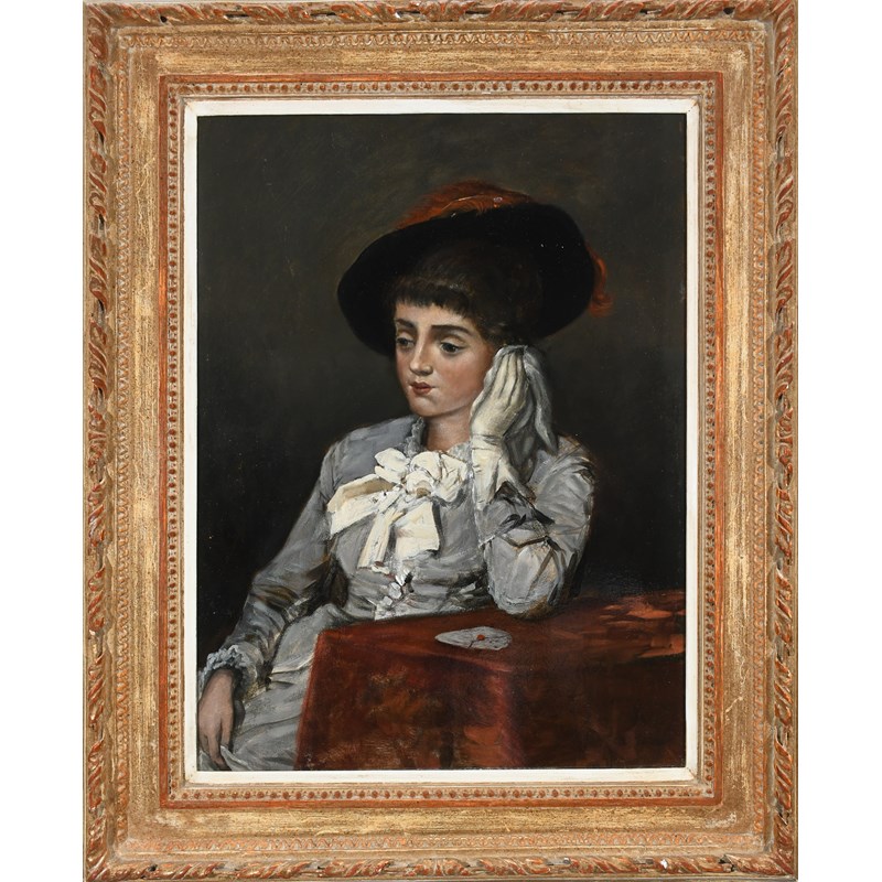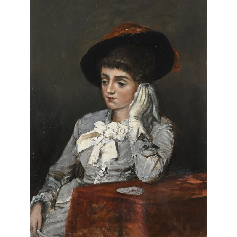 Portrait of a lady, wearing a grey dress and feathered hat, seated by a table