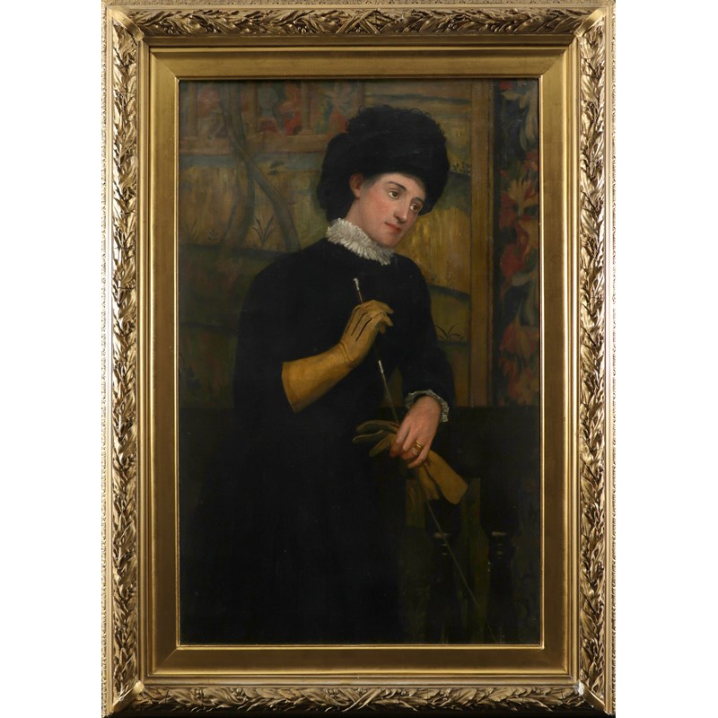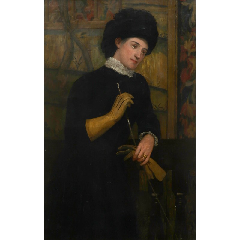 Portrait of Annie Barbara Hannah (née Thomson), (1849-1907) by a balustrade and holding a riding crop