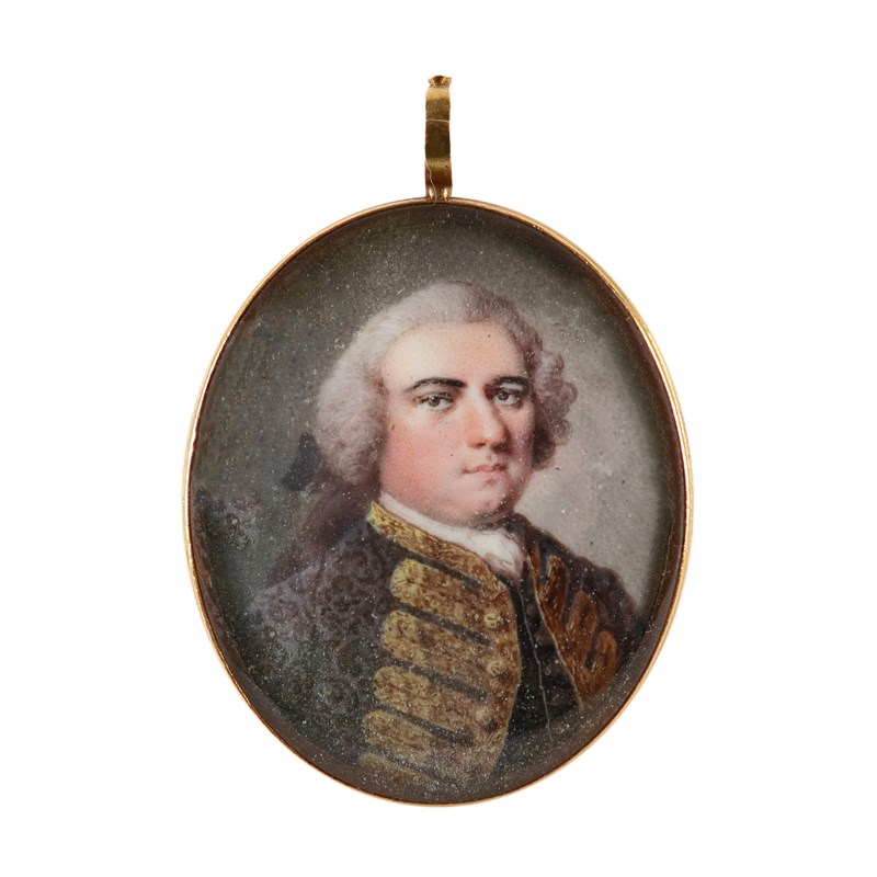 Portrait miniature of a gentleman wearing a grey embroidered coat with gold frogging, his powdered hair en queue