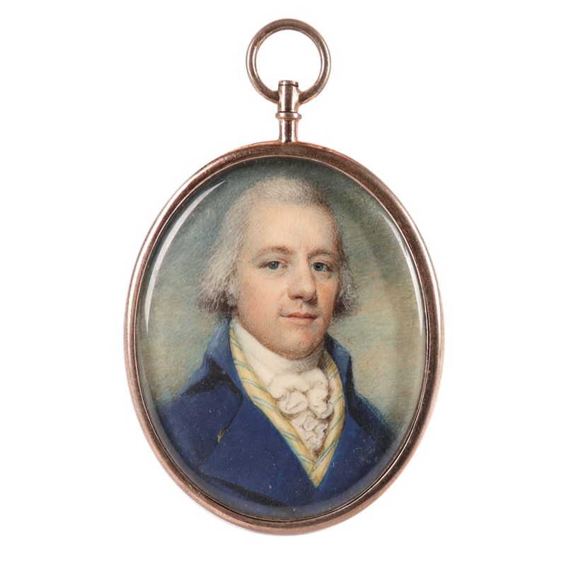 Portrait miniature of a gentleman wearing a blue coat and a yellow striped waistcoat