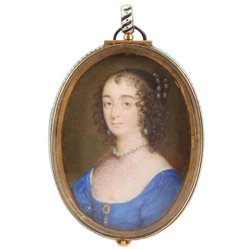 Portrait miniature of a lady wearing a blue dress, and pearl necklace and earrings