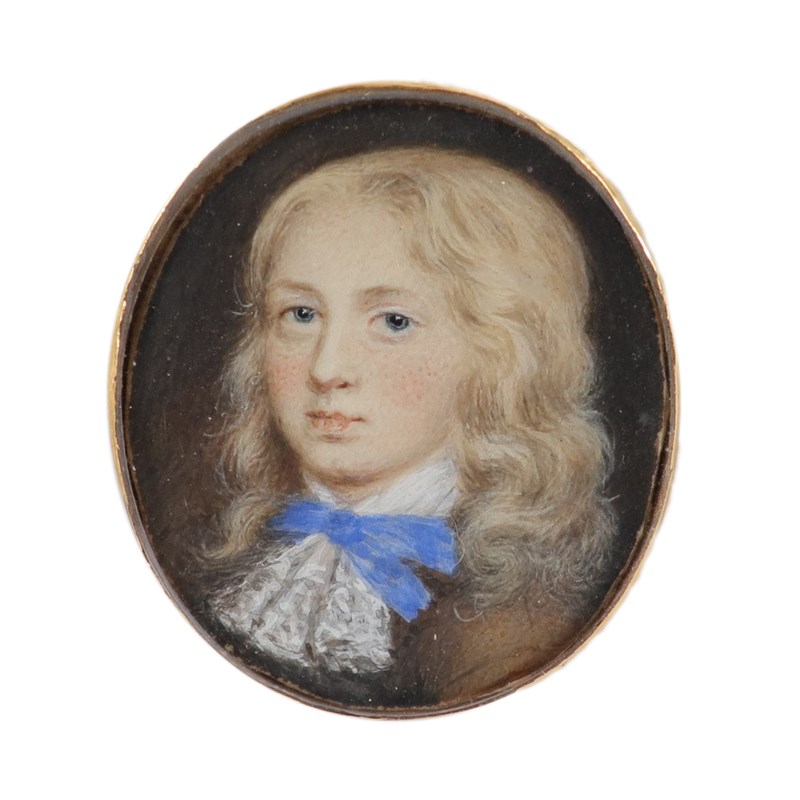 Portrait miniature of a young boy wearing a lace cravat and blue ribbon