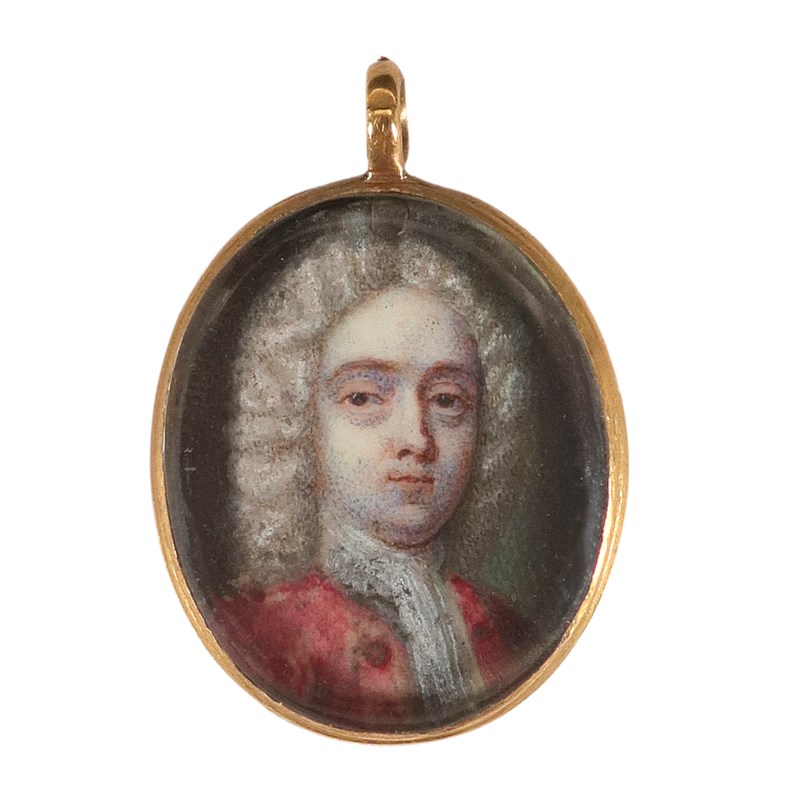 Portrait miniature of a gentleman wearing a red coat and powdered long wig