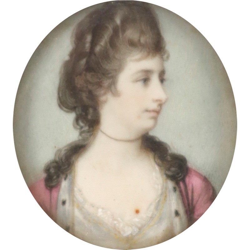 Portrait miniature of a lady, wearing a white dress with pink ermine-lined jacket