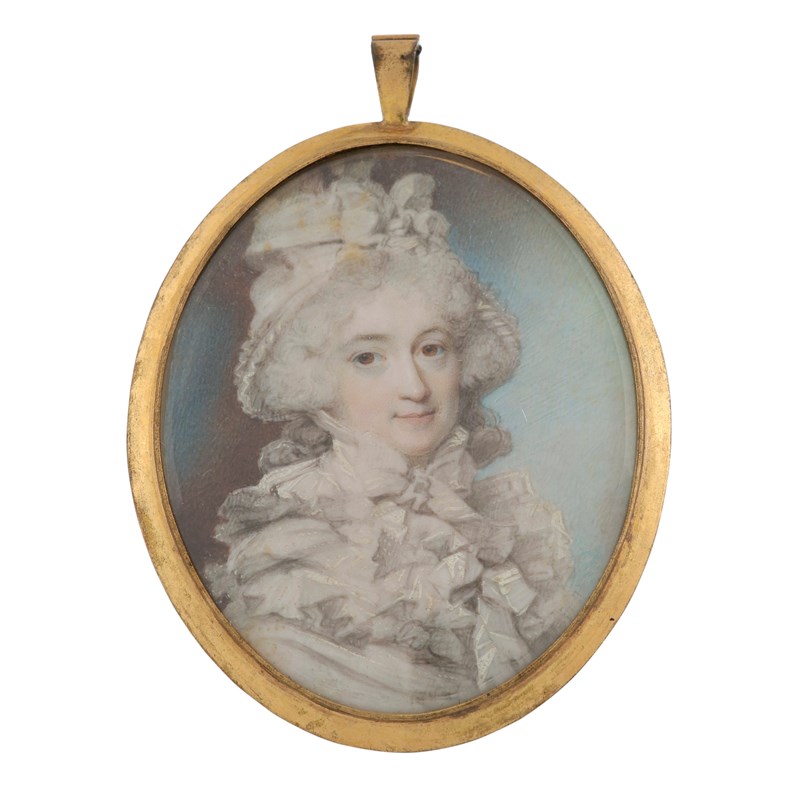Portrait miniature of a lady, wearing a white dress with layered frilled collar and bonnet
