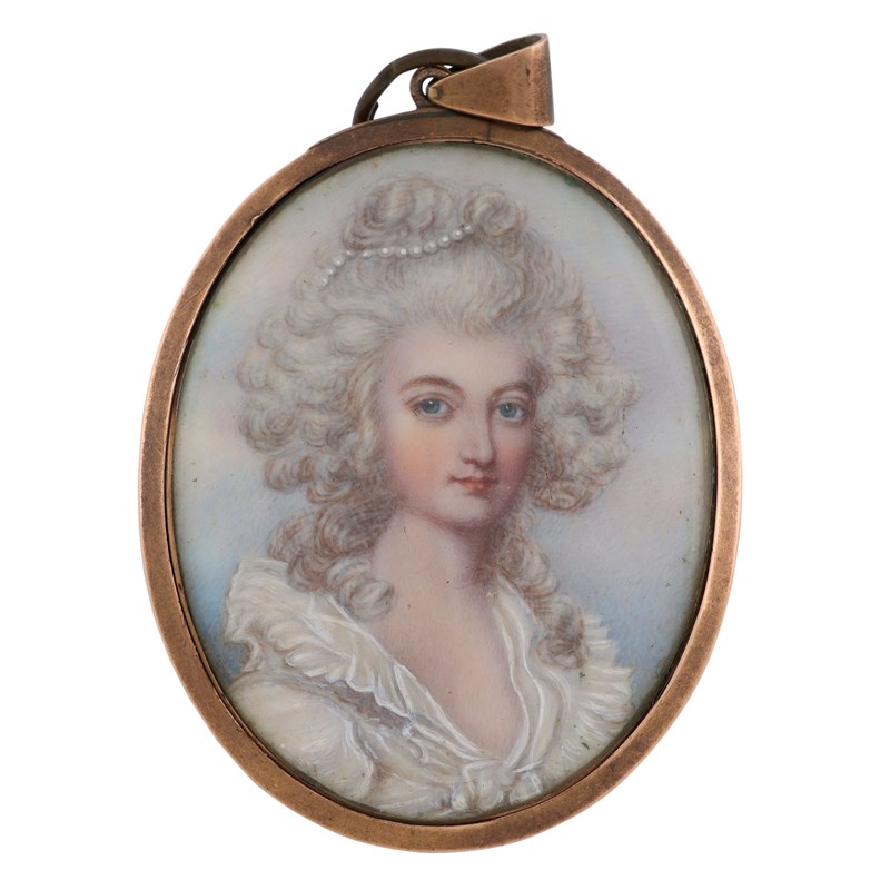Portrait miniature of a lady, wearing a white dress, with pearls in her hair