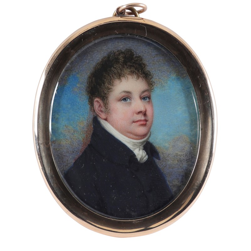 λAdam Buck (Irish 1759-1833) Portrait miniature of a gentleman in a blue coat and white stock...