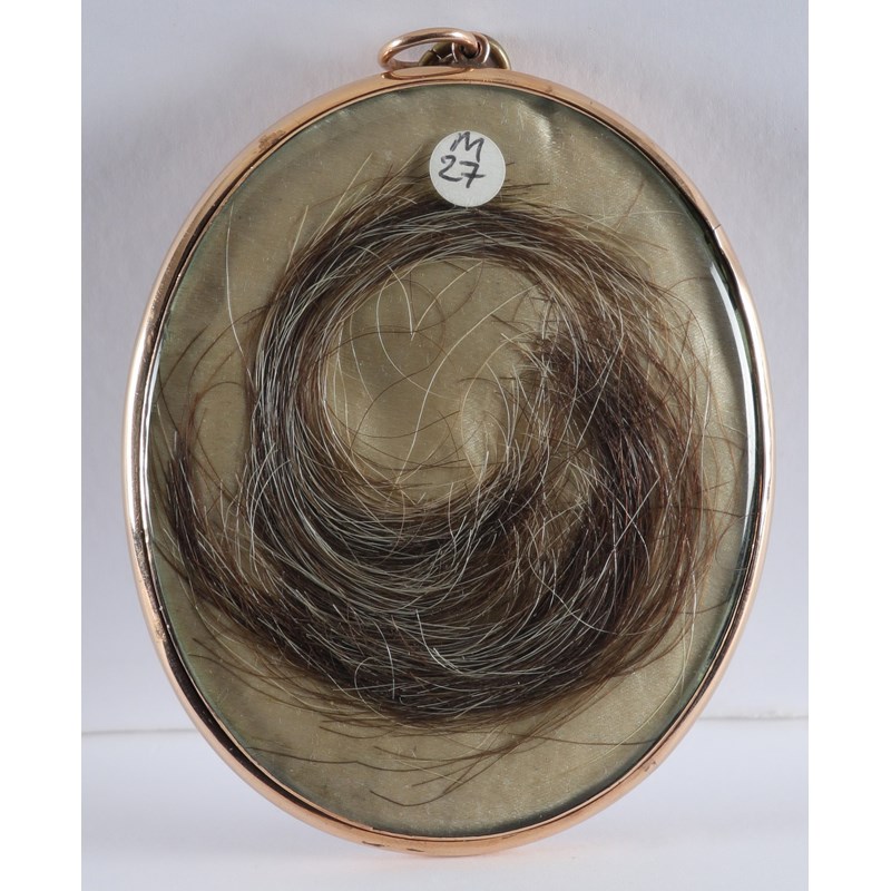 Oval, in a gilt metal frame, silk back with a lock of hair