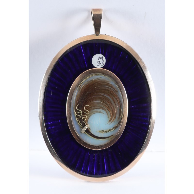 Oval, in a gilt metal frame, blue glass over guilloché and mother-of-pearl back with a lock of hair held by four pearls