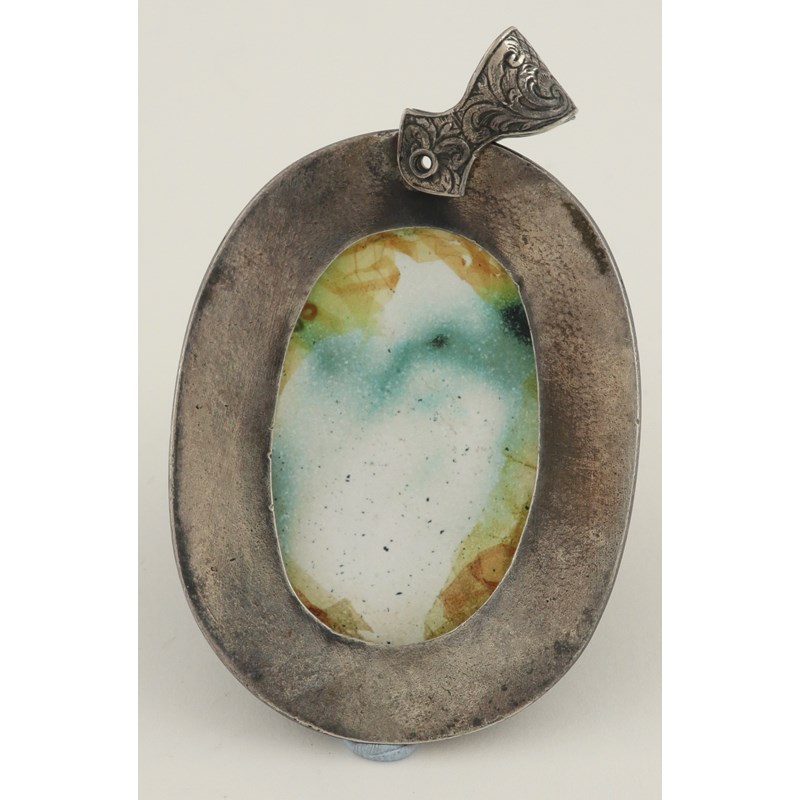 Oval, enamel over printed base, in a white metal frame