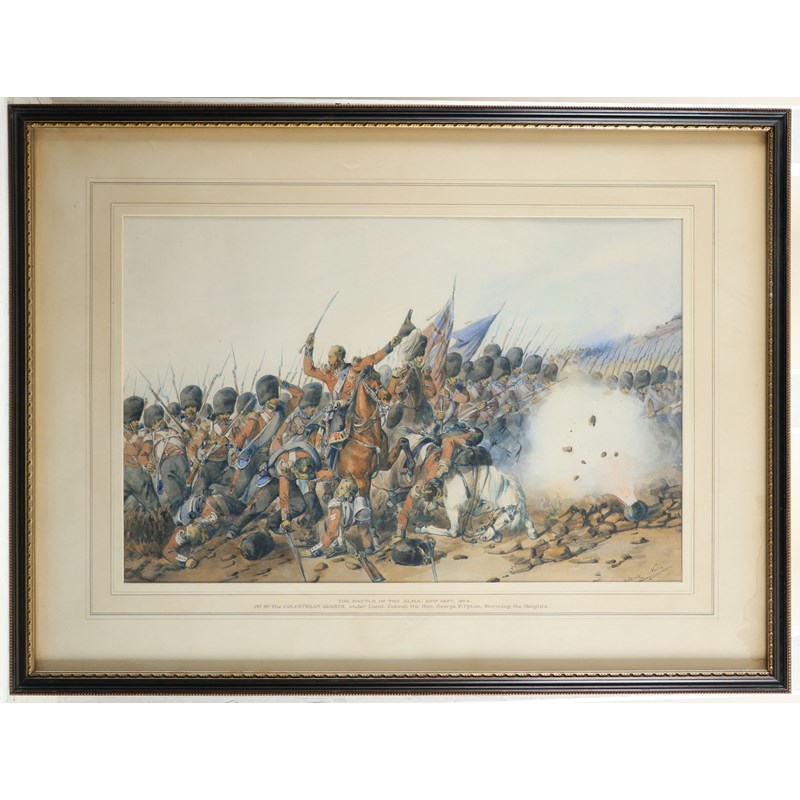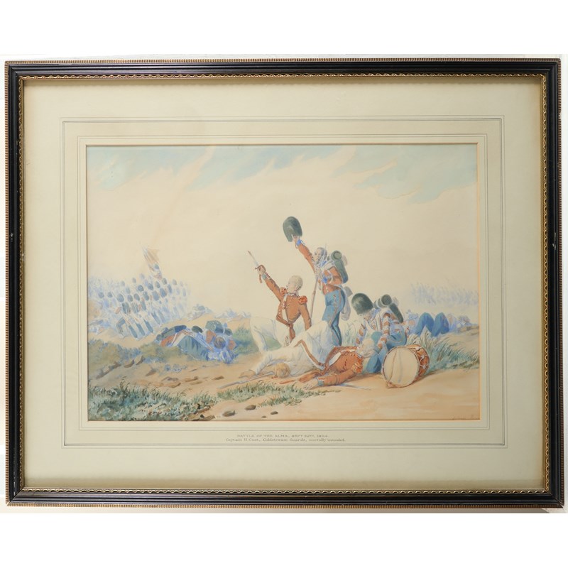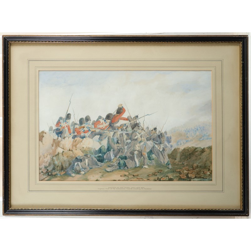 Battle of the Alma: 1st Bn. The Coldstream Guards, under Lt. Col. the Hon. George F. Upton, storming the heights; Captain Cust of the Coldstream Guards attacking the Russians; Captain H. Cust, Coldstream Guards, mortally wounded