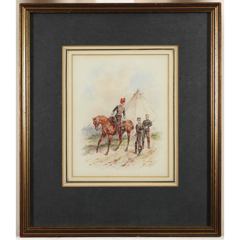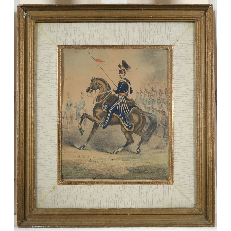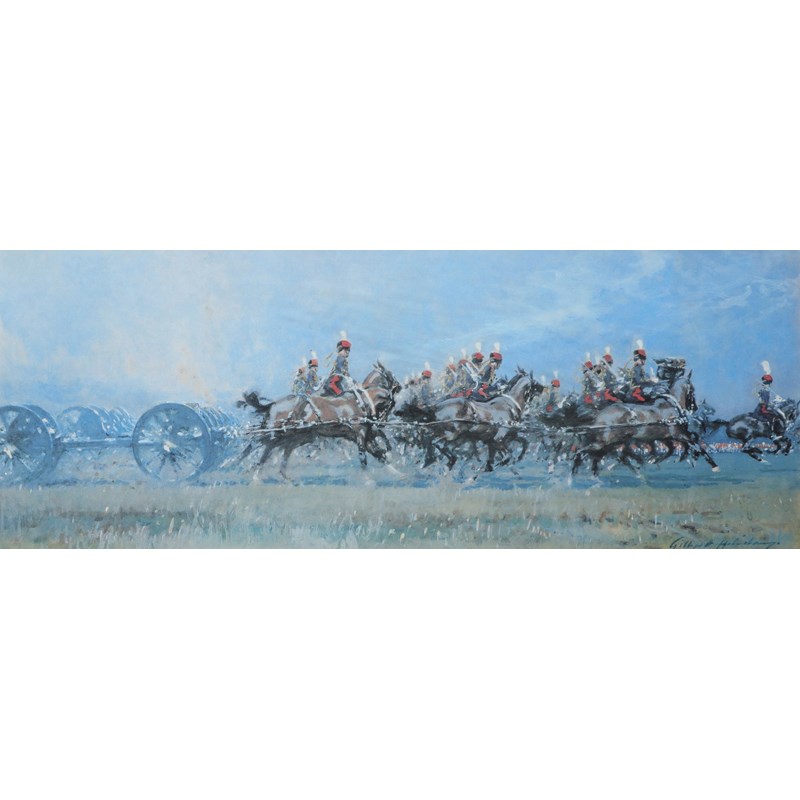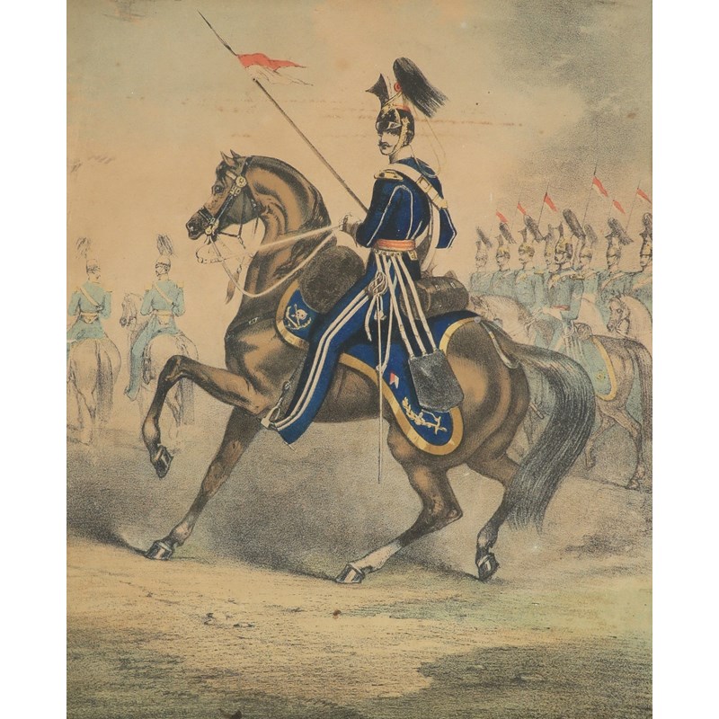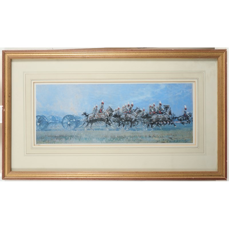 Together with Gilbert Holiday (1879-1937); Royal Horse Artillery; numbered 474/500 in pencil to margin; lithograph; 18.3 x 48.9cm; 7¼ x 19¼in; and a 19th Century hand-coloured print of an officer on horseback (3)