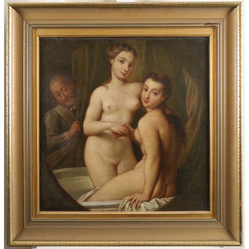 French School 18th Century Two nudes with a gentleman voyeur Oil on canvas in a painted cartouche...