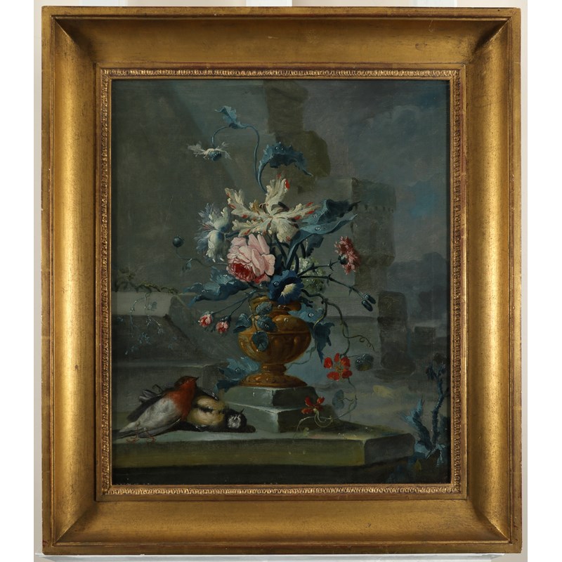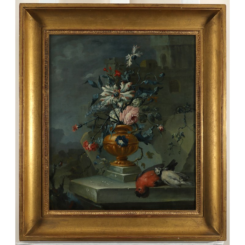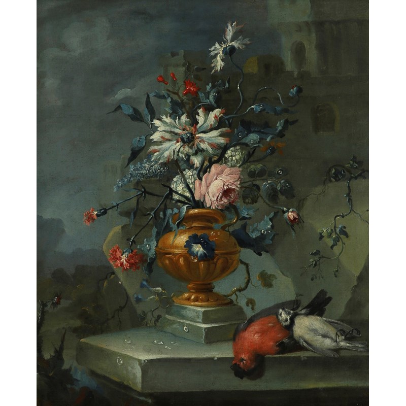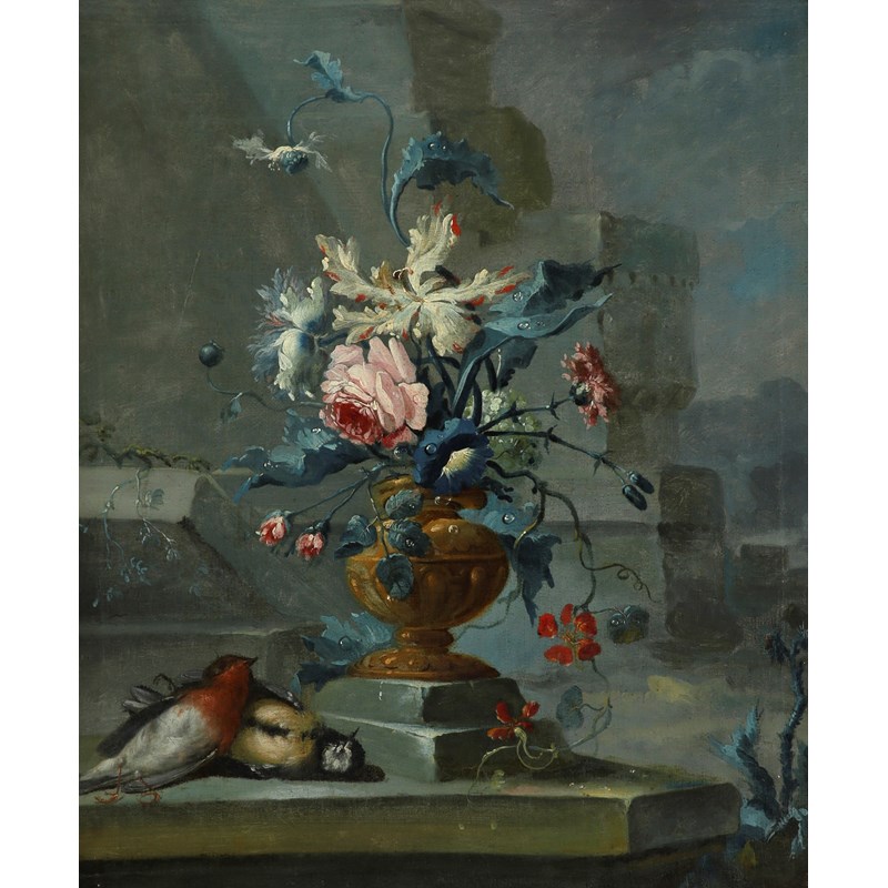 Still life with a vase of peonies, nasturtium and other flowers, with dead birds; Still life with a vase of peonies, morning glory and other flowers with dead birds