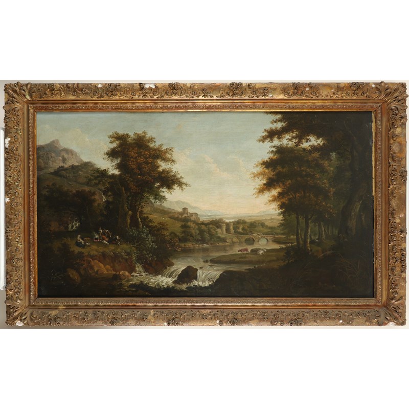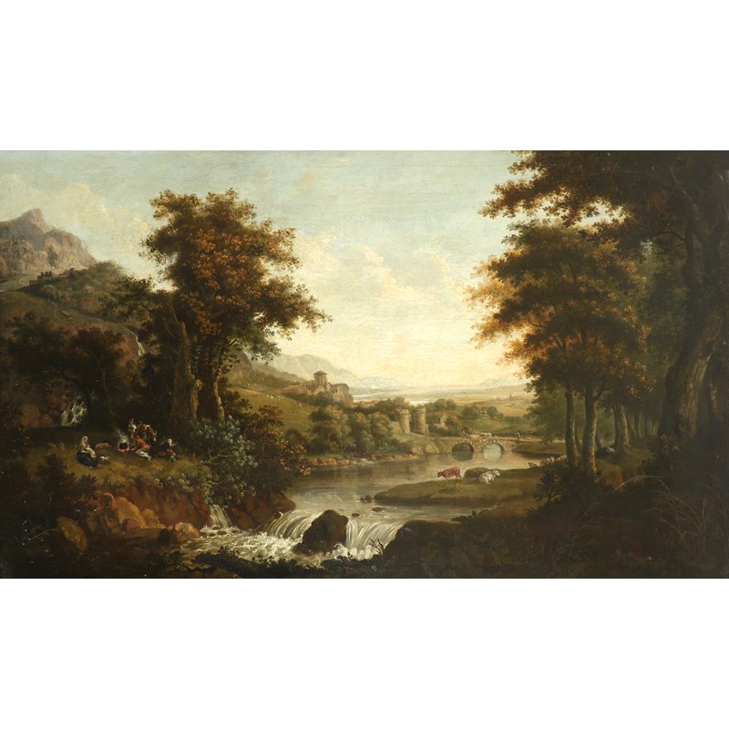 George Smith of Chichester (1714-1776) Mountainous river landscape with rustics by a fire and a...