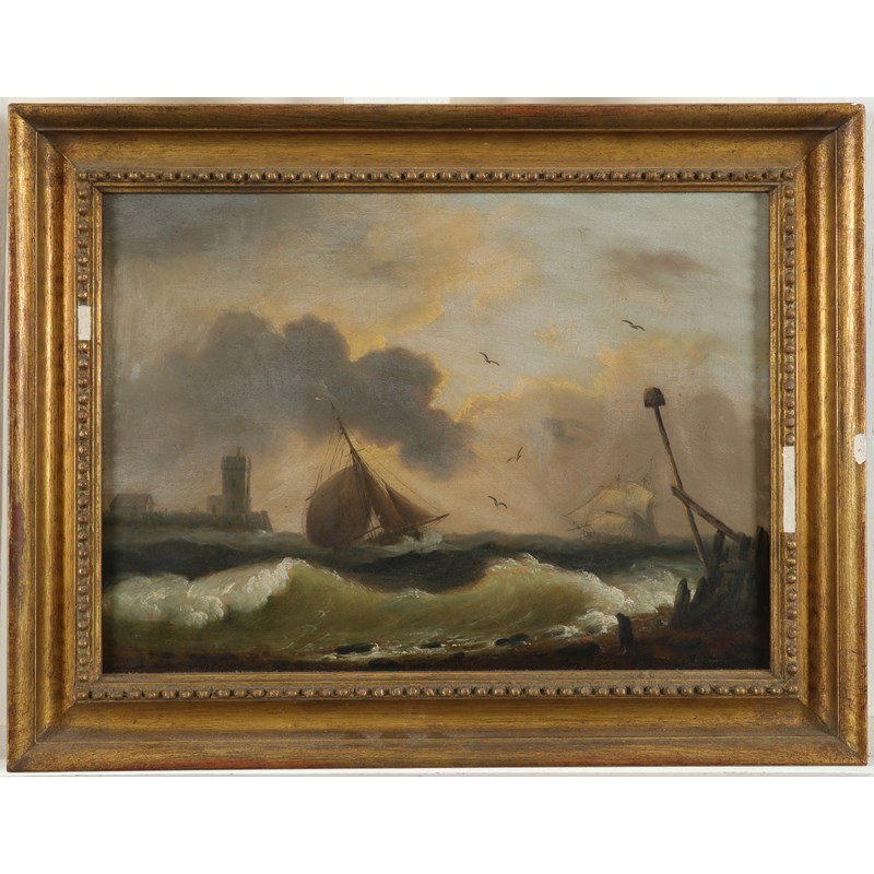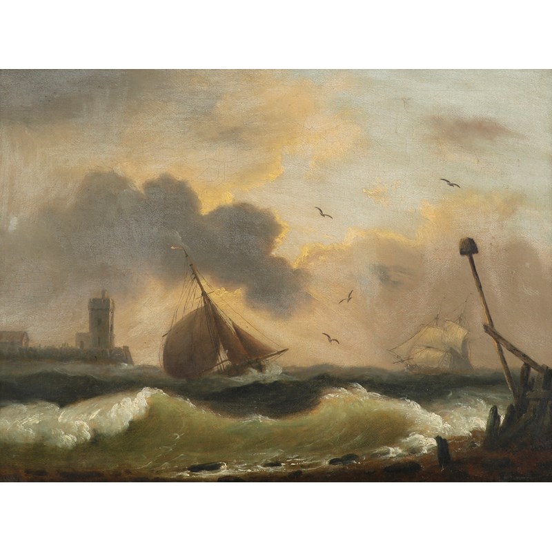 Thomas Luny (1759-1837) Ships in choppy coastal waters Signed and dated 1818 Oil on canvas 25.8 x...