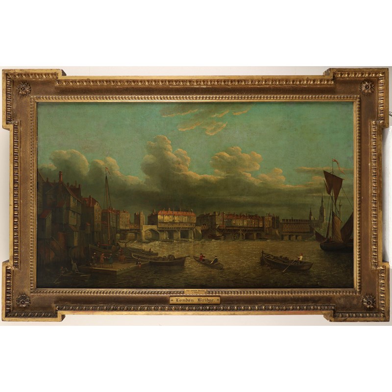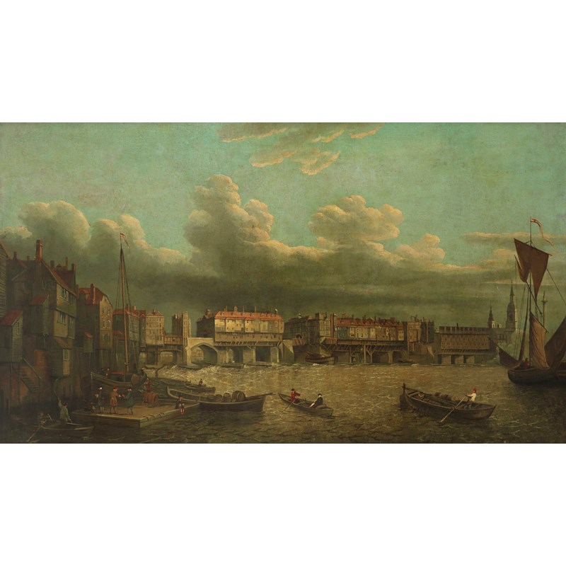 The present work shows Old London Bridge from the east as it appeared in the mid 18th Century. At the southern end is the Great Stone Gateway, Nonesuch House house in the middle, and at the northern end a block of ten houses that George Dance designed in 1745. At one point the longest habitable bridge ever built, it comprised nearly 140 houses and shops, rising up through four stories. The houses were eventually removed in the 1760s, but even then the bridge was too narrow for the 90,000 people a day who used it, and it was eventually replaced in 1832.