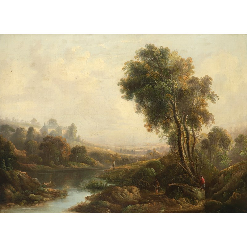 English School Early 19th Century River landscape with figures on the bank Oil on canvas 45.5 x...