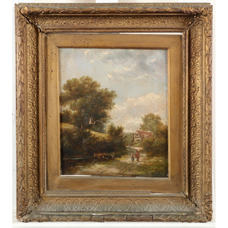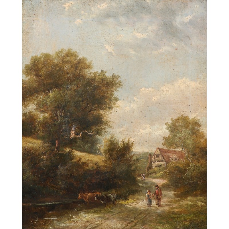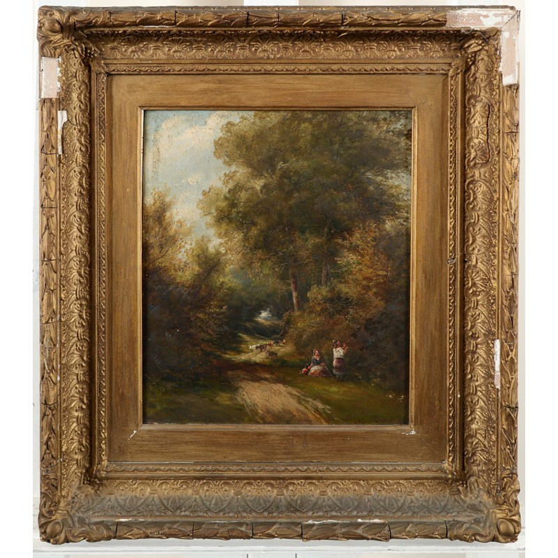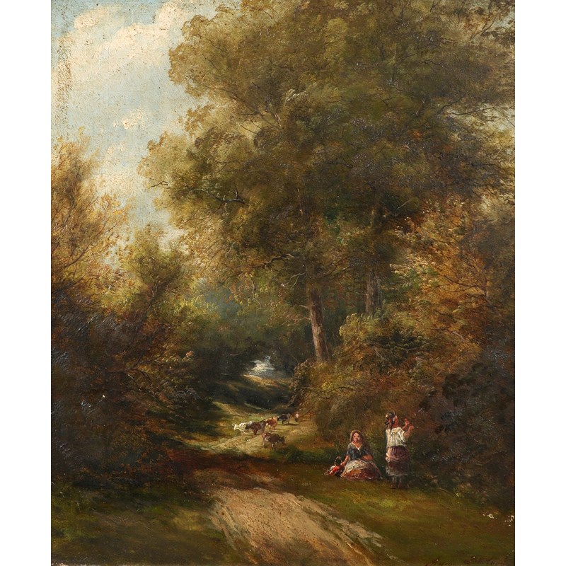Adam Barland (1843-1875) Two women resting on the side of a tree-lined road; Figures halting on...