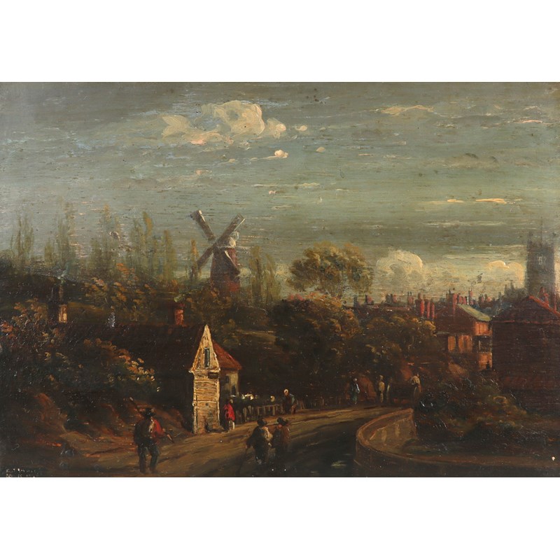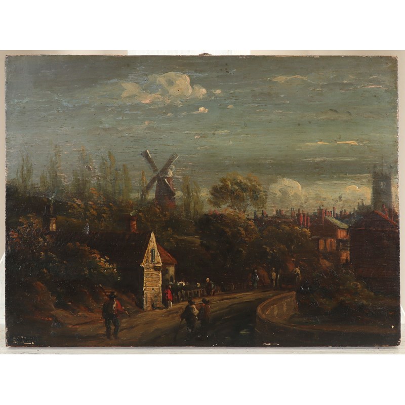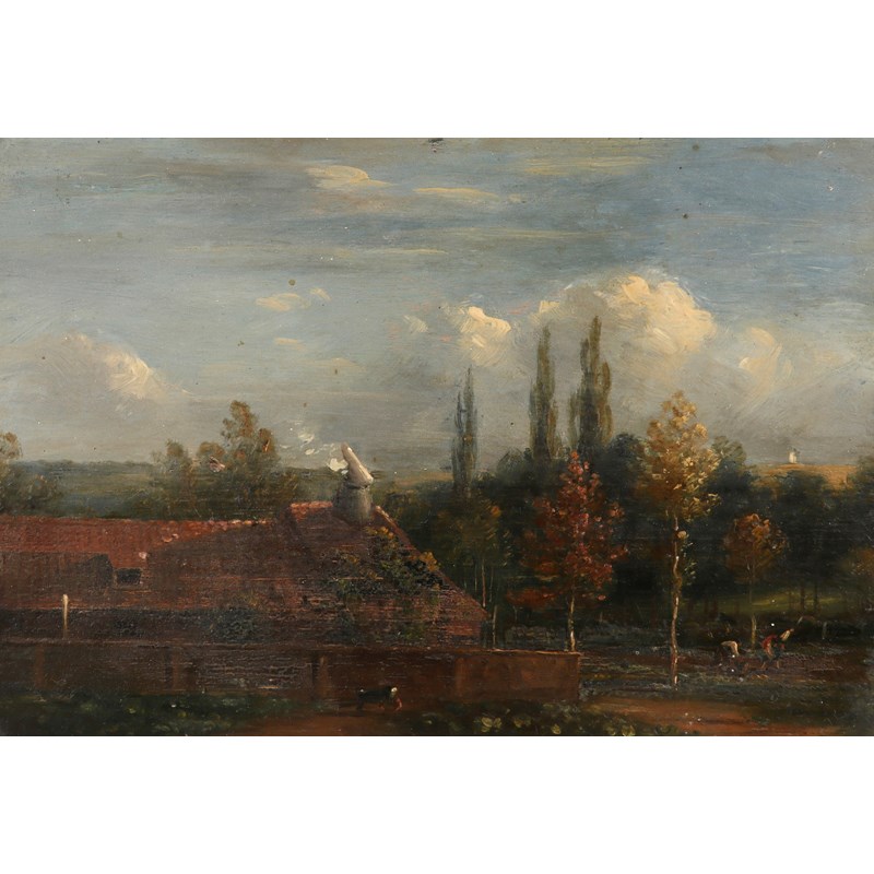 Figures on a road outside a town; Figures outside a farm building