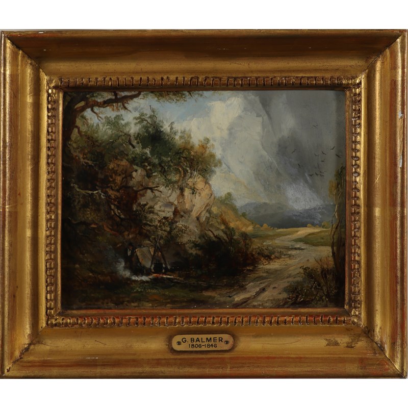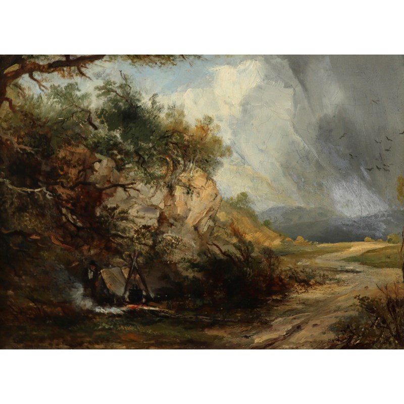 George Balmer (1806-1846) Landscape with a man by his campfire Oil on panel 13.7 x 19.7cm; 5½ x 7¾in