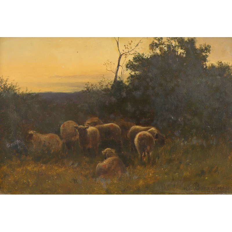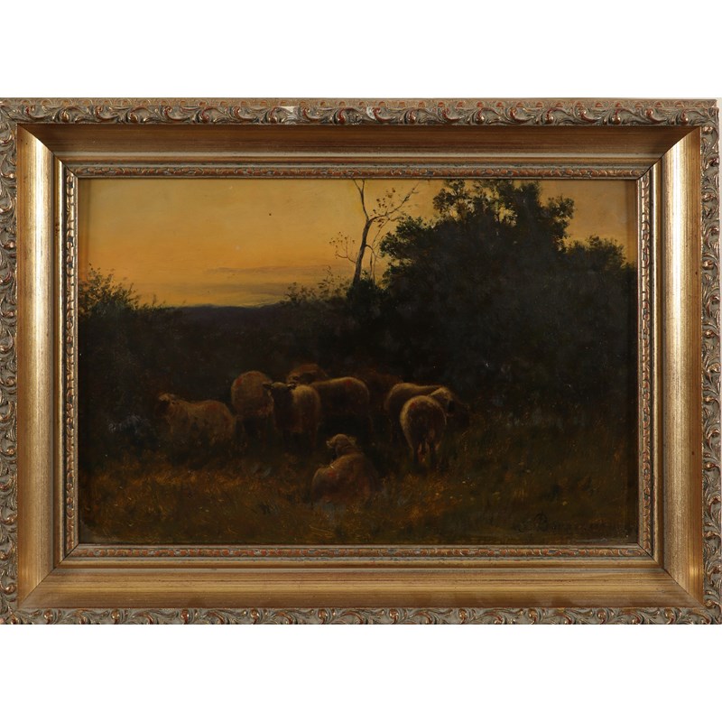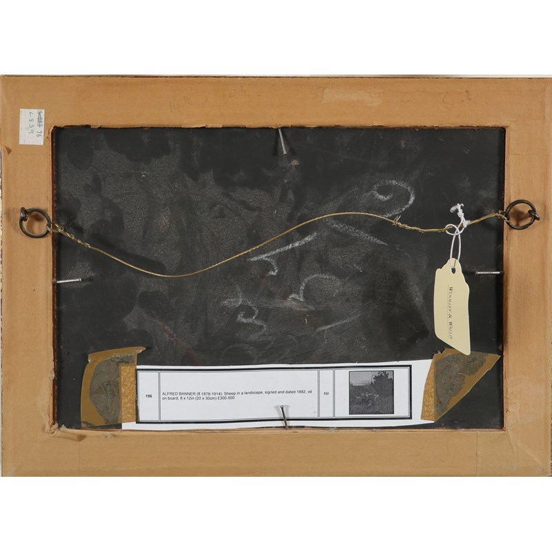 Alfred Banner (act 1880-1915) Sheep in a landscape at dusk Signed and dated 1882 Oil on board...