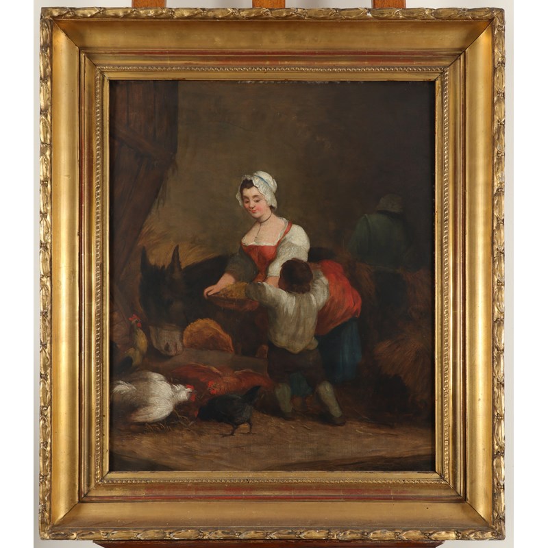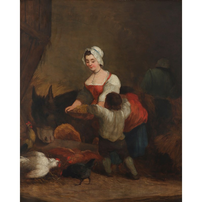 English School 19th Century A mother and child feeding chickens and a donkey in a stable Oil on...