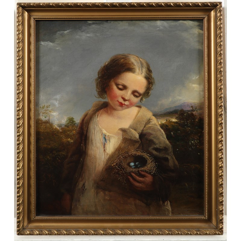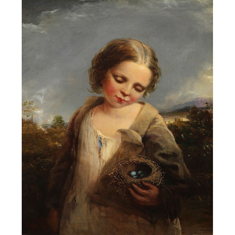 John Faed RSA (1819-1902) Young girl holding a bird's nest Signed Oil on canvas 40.6 x 33cm; 16 x...